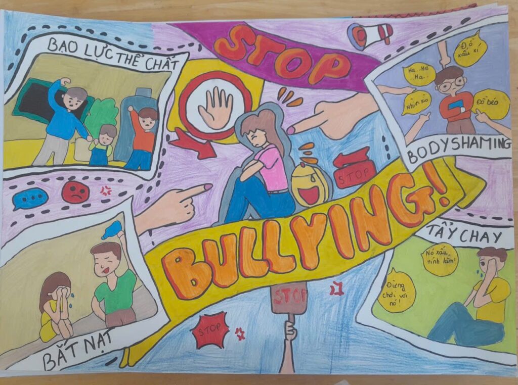 Một bức tranh mang tính trực diện và quyết liệt với dòng chữ “STOP BULLYING!”.