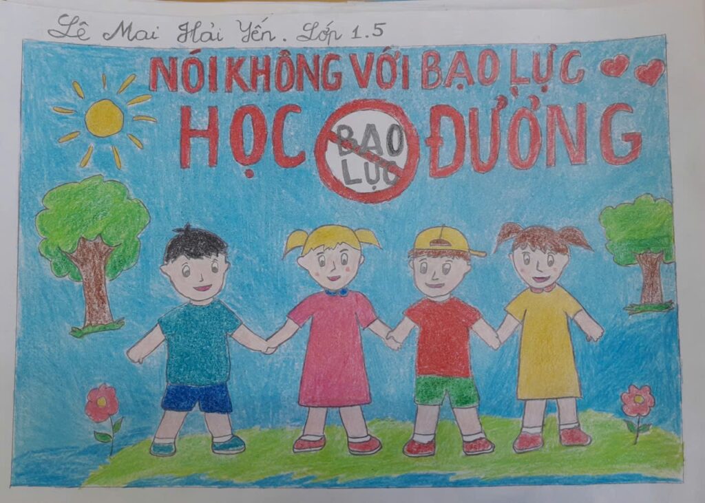 Thông điệp: “Nói không với bạo lực học đường” thông qua hình ảnh 4 bạn nhỏ nắm chặt tay nhau trên thảm cỏ xanh.