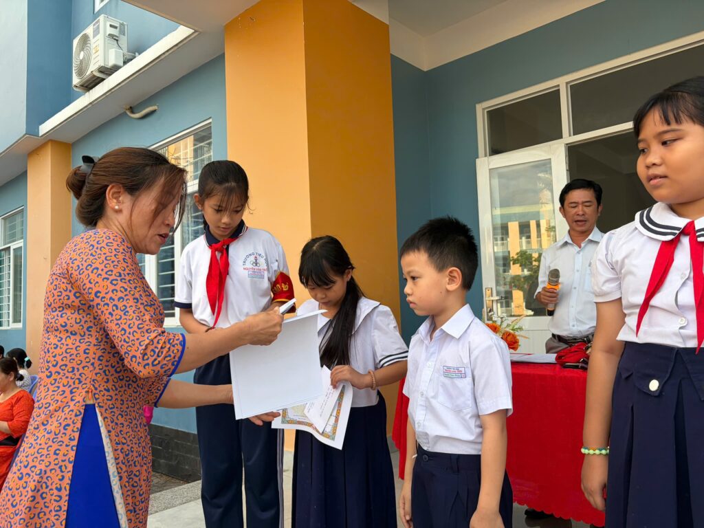 Cô Phạm Thị Thuyết, Tổ trưởng tổ Khối 5 trao phần thưởng cho các bạn đồng Giải Ba